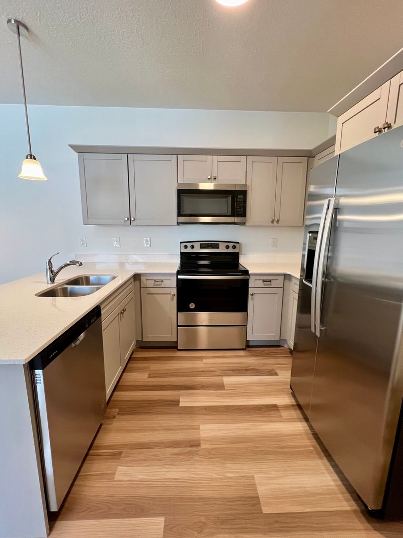 Welcome to this brand-new condo featuring a spacious living area, high ceilings, room-darkening draperies in the bedrooms, stainless steel appliances, tankless water heater, and a large laundry room with washer/dryer hookups and ample storage. The 1-car garage has been painted and the floor epoxied for easy clean-up and maintenance. Relax on the balcony during summer evenings or enjoy the nearby hiking and biking trails.